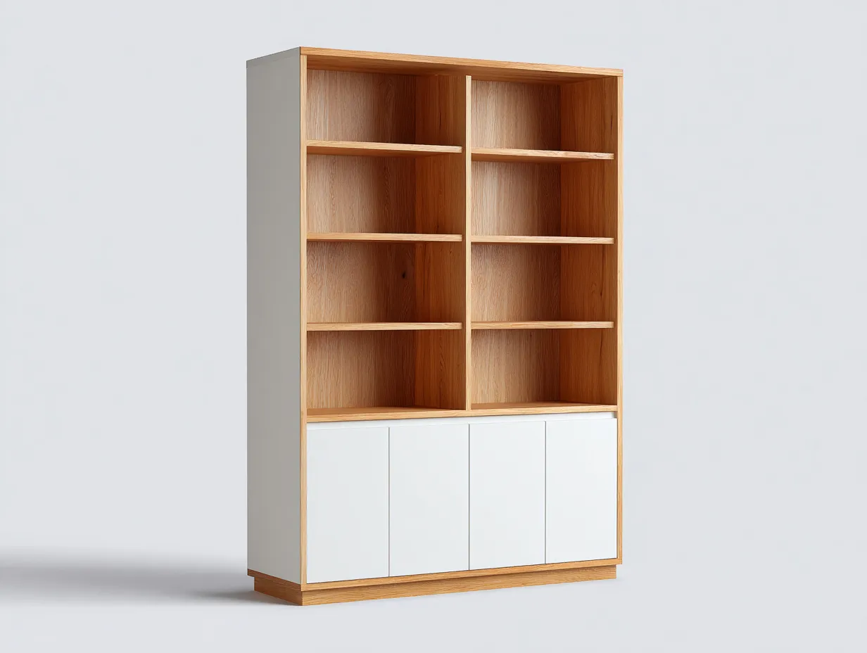 Die offenen Regalbereiche ermöglichen eine übersichtliche Platzierung häufig genutzter Gegenstände, während der untere Bereich geschlossenen Stauraum für eine aufgeräumte Optik bietet. Das Regal lässt sich flexibel in moderne Einrichtungskonzepte integrieren.
