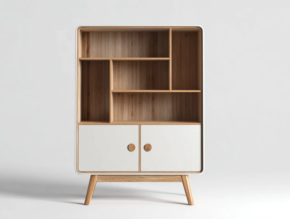 Die offenen Regalflächen ermöglichen eine übersichtliche Platzierung häufig genutzter Gegenstände, während der untere geschlossene Bereich eine ordentliche Aufbewahrung unterstützt. Das Möbelstück lässt sich harmonisch in skandinavische und moderne Einrichtungskonzepte integrieren.